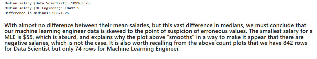 Conclusions:- The means of the salaries posted for Data Scientist and Machine Learning Engineer are nearly identical.- The medians of the salaries, in our dataset, were widely disparate.- By doing a little data cleaning, removing the bottom 10% of MLE salaries, we were able to show that the medians and other quartiles are nearly identical. This cleaning was justified, since some of the salaries for the MLE column were absurdly low, as low as $55!