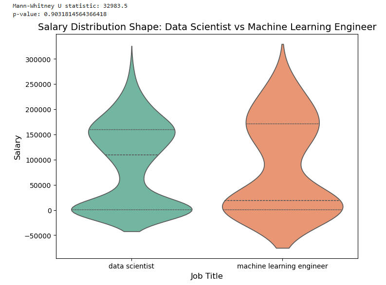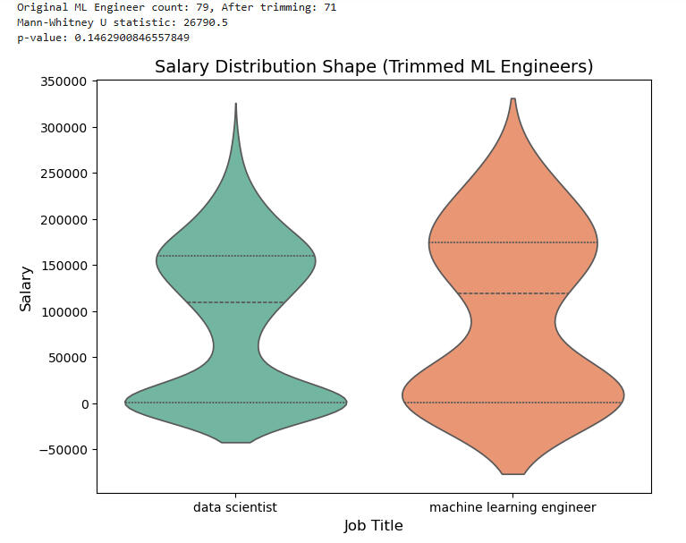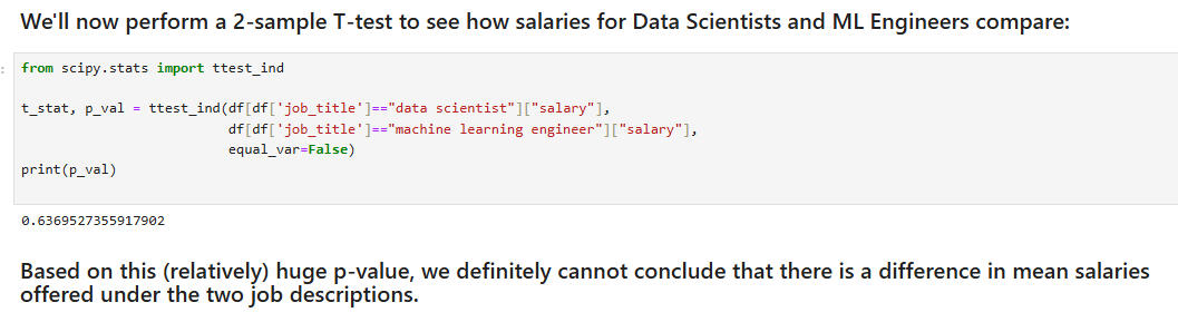 We'll now perform a 2-sample T-test to see how salaries for Data Scientists and ML Engineers compare: