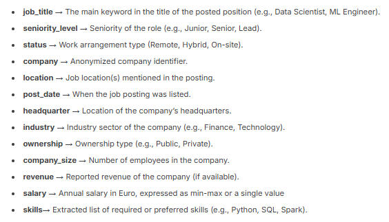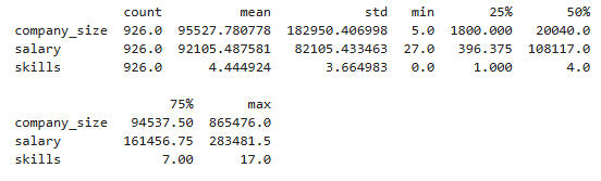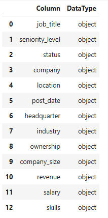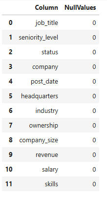 As described in the ReadMe, we converted company-size, revenue, salary, and skills into numerical columns. Post_date was dropped, since it contained 2025 as its only value.