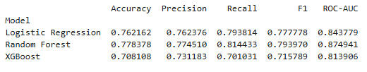 Observation on the above values:The Random Forest model performed the best in all metrics, with a fairly impressive 78% accuracy and 81% recall.